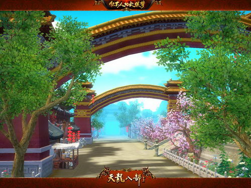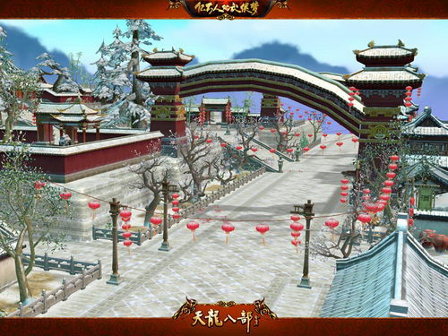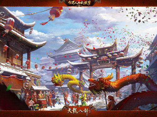 全新洛阳城呈现眼前 洛阳,以威严的皇家气度与连绵的亭台楼阁成为《天龙八部》中最巍峨的主城。宏伟的府前广场、繁华的东西大街、日日激战的校场、人头攒动的九州商会……每位玩家初到洛阳城,总有眼花缭乱不知所措的感觉。 而新原画中的洛阳城银装素裹,把严肃的外衣褪下,换上一副亲和的面容。那喧天的锣鼓,漫天纷飞的彩纸,翩若惊鸿的舞龙,熙熙攘攘的人群,无不渗透着一股浓浓的年味儿。没有了往日的剑戟林立,没有了侠士们剑拔弩张的对峙,热烈的节日气息已经把往日的仇怨纠葛通通化解,此时的江湖不需要你的战斗,只需要你来享受!