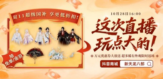 少侠们好呀,前两日八妹带大家走进了「明星玩家团」成员的天龙江湖。其中八妹还提前和大家预告了羽毛球冠军王昶带来的江湖惊喜:明星玩家球拍同款的专属定制幻武! 那么如何获得呢? 锁定10月28日 16:00,抖音“新天龙八部端游”官方直播间,天龙双十一国补专场,独家幻武、稀有外观返场、高力度补贴折扣等你! 天龙双十一国补专场 10月28日 16:00 抖音“新天龙八部端游”官方直播间 √明星玩家同款专属幻武,不限量首发 √吉庆千结、青阳山色等超人气外观限量返场 √抽奖抽到手软,金羽坐骑、免单机会抱回家! √新服专属时装、道具,尽享超低折扣! 明星玩家同款定制幻武 前两天八妹已经和少侠们预告了天龙端游18周年特别定制的幻饰武器「白羽流星」! 幻武在设计上以“明星玩家团”成员、羽毛球世界冠军王昶常用羽毛球拍为原型,沉稳外观下藏着十足爆发力,拍身萦绕的火焰动效,既呼应他赛场上的昂扬斗志,也代表了明星玩家和天龙之间的18年江湖炙热情谊。 既然是冠军同款羽毛球拍,怎么能没有帅气的击球扣球动作呢! 在游戏内施展专属的幻饰动作时,角色将进行一系列轻盈流畅的颠球动作,最后以一记强劲击球,将羽毛球如流星般击出,在空中留下绚丽的火光轨迹,将王昶灵巧飘逸的球风与锋芒毕露的个性巧妙结合,呈现了他在赛场上的竞技精神与个人魅力。 未来,希望少侠们也能手持“白羽流星”,在属于自己的江湖赛场上,打出那制胜一击! 10月28日,来抖音直播间get明星玩家同款幻武「白羽流星」!更有直播惊喜价格! 神秘嘉宾空降现场 少侠们还记不记得嘉年华现场扛着音响、随机刷新在街头巷尾的“萧峰”大哥,许多少侠纷纷感叹,这是真的把“萧峰本峰”请到了现场吗? 这次直播专场,萧峰大哥(抖音:@7哥乔峰)也会化身福利官,为各位少侠抽取海量福利! 永久坐骑:金羽、免单机会、稀有珍兽、精美周边究竟会花落哪些少侠家!锁定直播间,说不定下一个天龙锦鲤就是你! 更多直播详情前瞻↓ 少侠可以点击下方长图,查看更多直播详情内容↓↓↓ 为了让少侠们能够更丝滑的选购到自己心仪的货品,八妹准备好了详细【购买须知】,少侠们务必仔细阅读噢↓↓