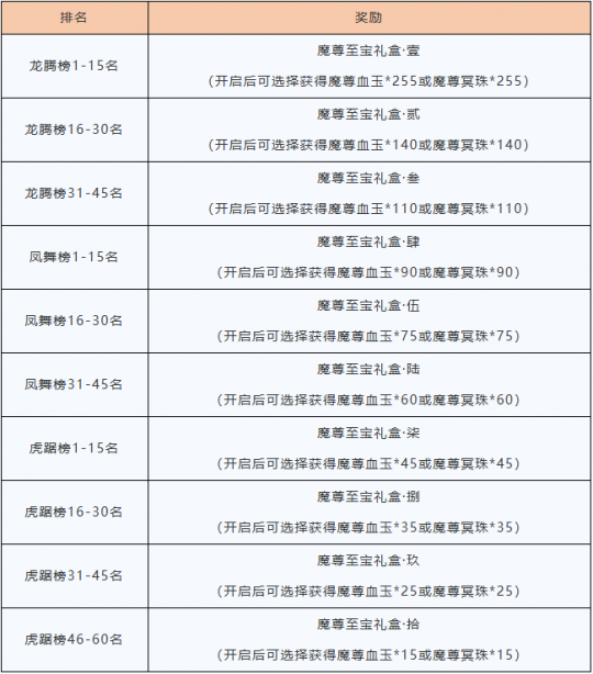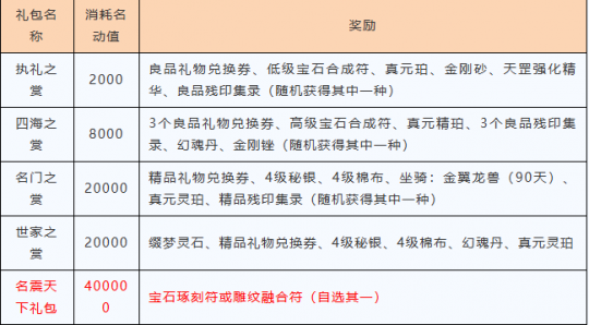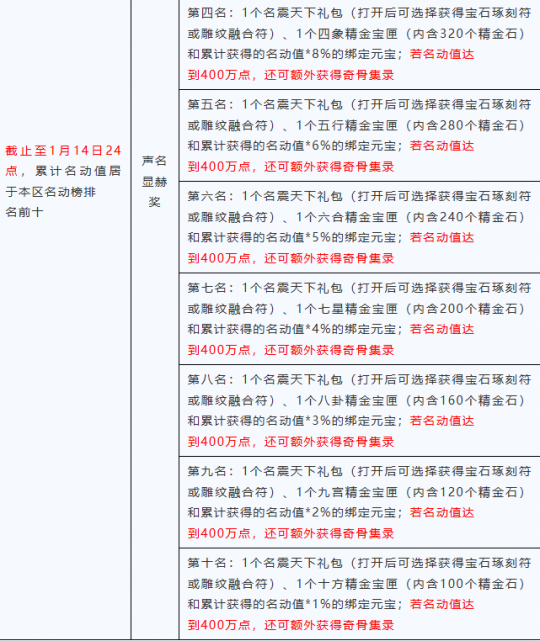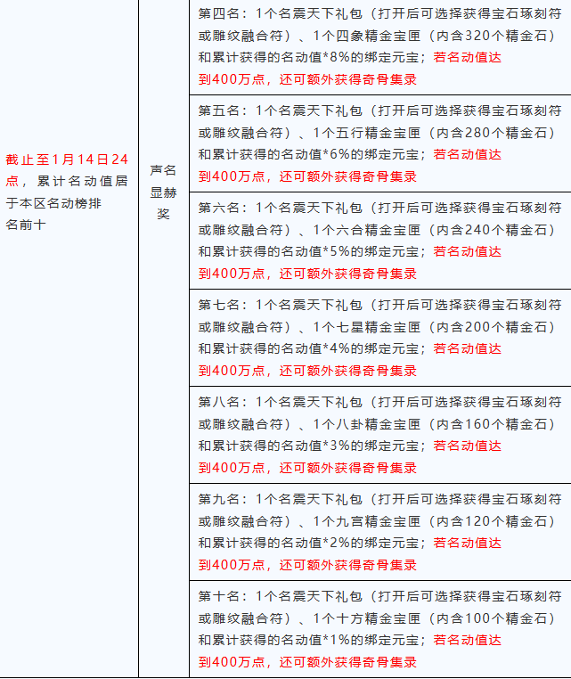 【精彩活动】 名动江湖 1月8日更新后至1月14日24点,等级≥15级的少侠,点击小地图下方的“名动江湖”按钮即可参与该活动。 活动期间,每消费1元宝,名动值提升1点。累计获得名动值达到4万点的少侠,将有机会登上本区名动榜;累计获得的名动值达到400万点且在本区名动榜排名前10的少侠更有机会登上傲世重楼榜。 此外,1月18日24点前在洛阳钱庄(61,43)莫寻处或名动江湖活动界面中消耗一定数量的名动值即可兑换珍贵的道具礼盒,打开礼盒将有机会获得稀有的元宝道具。 小提示: 1、【少年游】【战天门】将不参与名动江湖活动。 2、名动江湖活动期间,所有元宝消费也不增加帮会红包的鸿福值。 3、所有奖励请在1月18日24时前领取或兑换。 本区名动榜 奇骨集录:可选择获得神品心诀:奇骨·冰、奇骨·火、奇骨·玄、奇骨·毒中的一种。 二、傲世重楼榜 在本区名动榜排名1-3名的玩家最高可进入龙腾榜,4-6名的玩家最高可进入凤舞榜,7-10名的玩家最高可进入虎踞榜。累计名动值越高排名越高,当累计名动值小于当前榜单的最后一名时,会进入后一个榜单进行排名。 1月14日24点傲世重楼榜上榜的玩家,可以根据排名获得不同数量的魔尊血玉或魔尊冥珠。集齐255个魔尊血玉的玩家可前往苏州(263,234)梁师成处,兑换魔界至尊:重楼链(绑定)、重楼甲(绑定)、重楼玉(绑定)或重楼戒(绑定)中的任意一个,集齐255个魔尊冥珠的玩家可兑换魔界至尊:重楼带(绑定)。 重楼带装备效果:受到控制期间,遭受来自玩家的伤害超过血上限25%时,自动解除自身所有负面效果(包括第八本心法和重楼控制效果),每30秒最多触发1次。 小提示:【胜者为王】【万武归宗】【心跳电波】【烟雨江南】服务器将不参与傲世重楼榜活动。 三、名动值兑豪礼 小提示:兑换消耗的名动值不影响累计名动值排名。名震天下礼包在本次名动江湖活动中只能兑换一次。 【更新优化】 组队副本经验分配优化 1月8日更新后,调整了除匪首力破三关、讨伐燕子坞、少室山、苏州四绝庄、挑战缥缈峰、普通琅嬛福地、困难琅嬛福地、凤鸣王陵、三神幻境的杀怪经验分配规则。玩家组队在副本击败怪物时,经验值固定按照6人队分配,而不再按当前人数平均分配。 红利宝石优化 我们后续将优化红利商店相关功能,因此1月8日更新后,将暂时关闭6级红利宝石向上合成7级红利宝石功能,并下架红利宝石店中的七级宝石斋。 畅易阁临时维护 1月8日7:00-7:30,畅易阁将进行维护升级。维护期间,暂时无法购买角色、浏览角色商品。给您带来的不便,敬请谅解,感谢您的理解与支持!