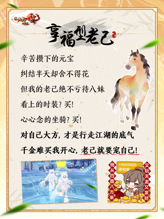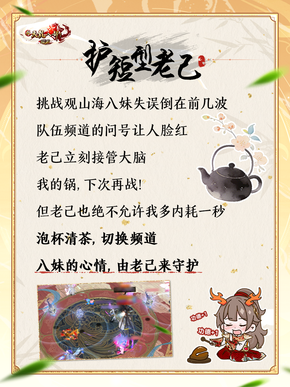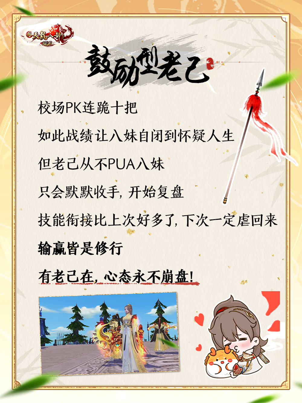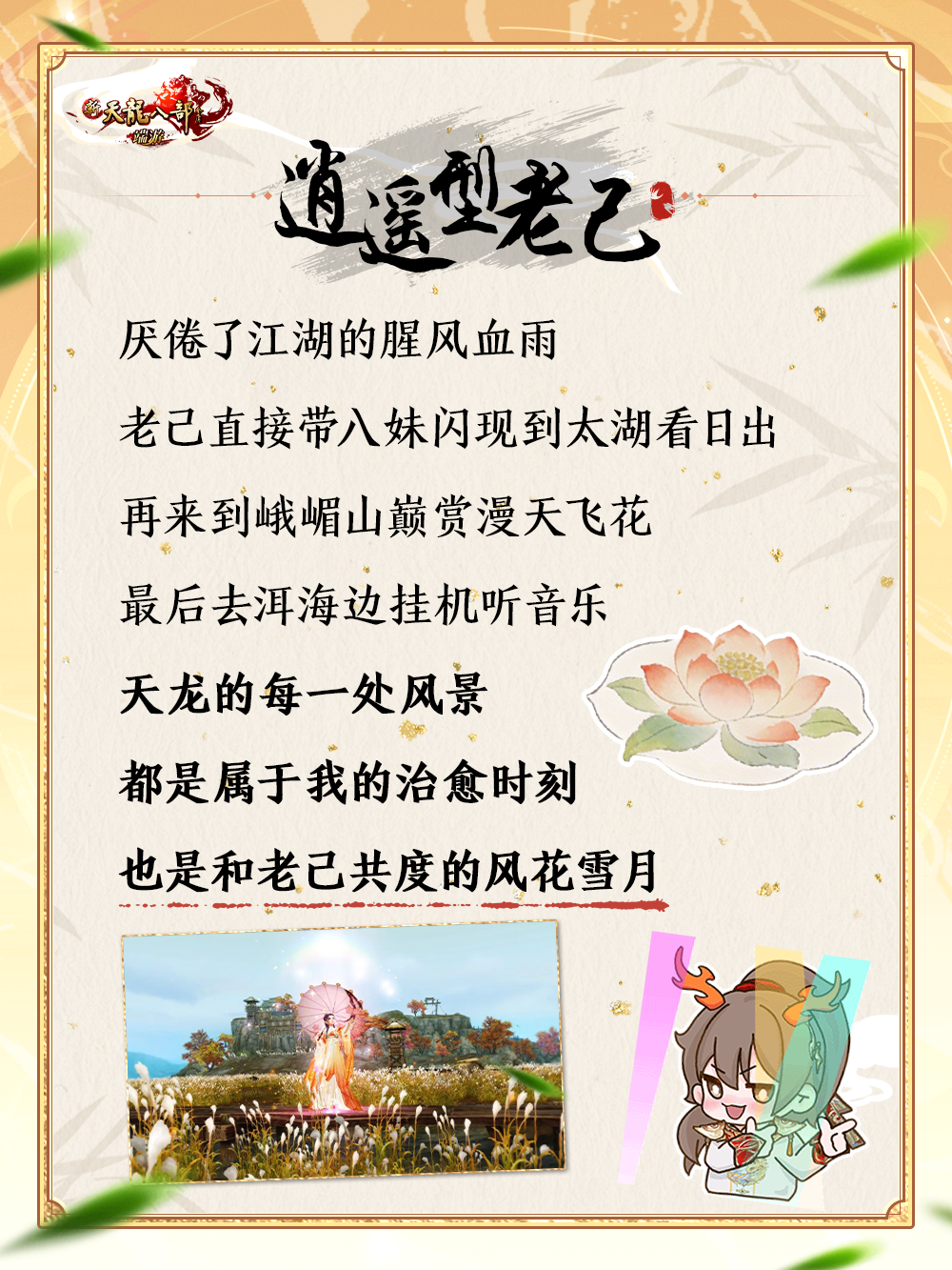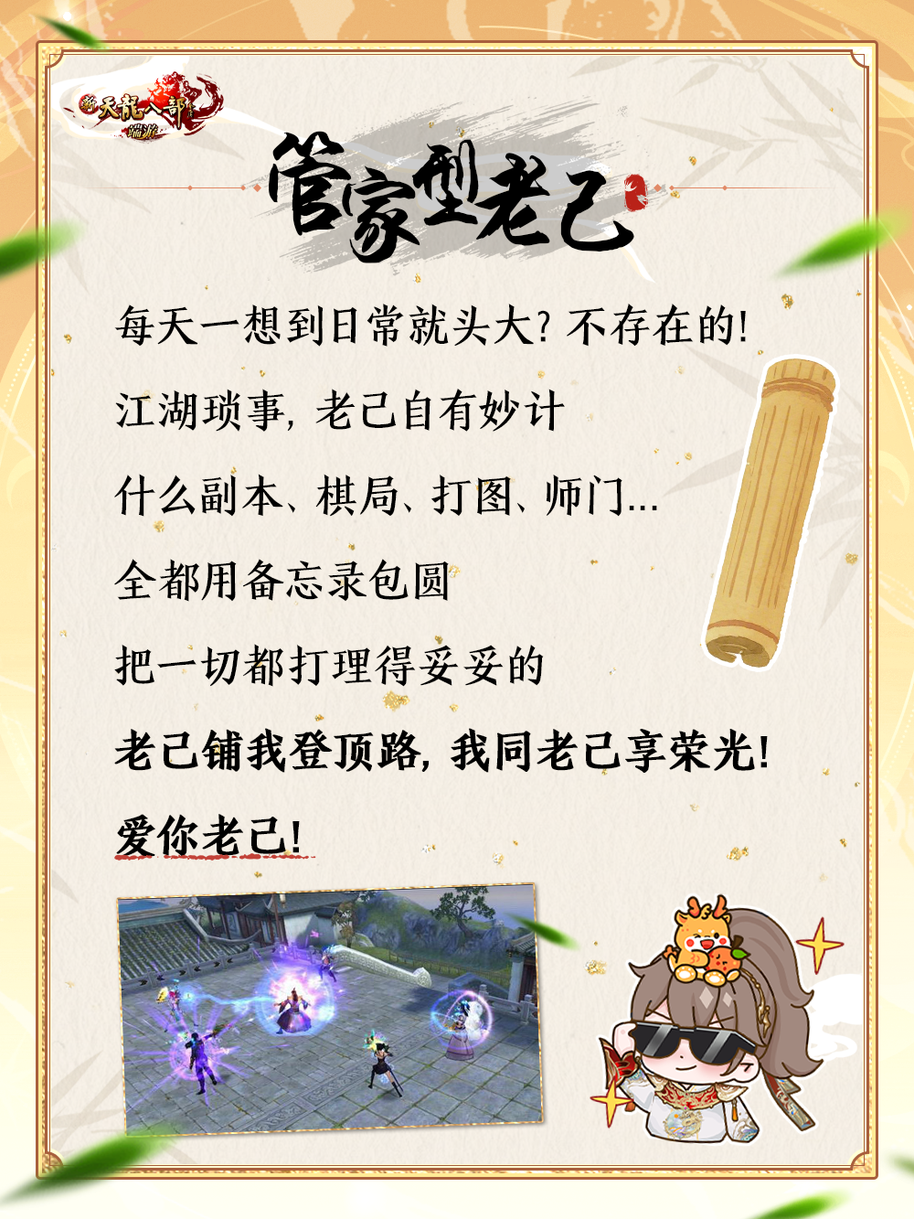 从迷路在洱海的小白,到横扫汴京的大侠;从一起刷马贼,到组建帮会攻城略地...来到天龙的每一个时刻,始终都有一个熟悉的身影陪伴在八妹左右。 TA是那个勤勤恳恳帮我清日常的??TA也是那个在我PK失利后鼓励我的??TA还是那个陪我共度风花雪月的...TA就是最靠谱的江湖搭子——老己??人来人往,我的老己永远在场!答应八妹,2026年也要继续爱自己呀。