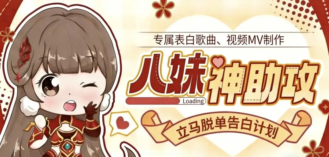 少侠们好呀,26年的第一个月快要结束啦,八妹打开日历看一眼,情人节已经进入倒数阶段! 您的“脱单小红娘”八妹已时刻准备好!马年,就要立马脱单! 少侠肯定又要问,“八妹八妹,那今年的活动是留言表白,还是loading图征集?” NO!这些“传统艺能”,都是八妹之前玩剩下的! 今年,我们玩点不一样的—— 这次,八妹会把你的心动故事谱写成歌,唱遍整个江湖! 爱要大声唱出来! 还记得吗? 那天在苏州城下组队,却意外组出了一段江湖情缘; 一起刷副本、一起看风景、一起在帮派里唠嗑到深夜…… 那些心动的瞬间,到底有多动听? 即日起,少侠可以向八妹分享你的江湖心动故事,八妹将借助AI技术为少侠编写演唱专属的表白歌曲,并制作成声画结合的视频MV,在公众号或视频平台向江湖全体少侠展示~ 01活动时间 1月27日-2月9日 02活动规则 投稿内容: 无论是和已成正果的CP相伴相识的天龙故事,藏在心头未说的仰慕爱恋,还是原创或改编的告白歌词、文案、小说……与天龙有关的心动故事,都可以分享给八妹噢~ 投稿形式: 以文字形式为主,图文兼备更佳 投稿方式: 文字内容可在评论区直接留言 长文或图文可投递至八妹邮箱xtlbbtg@sohu.com 03活动奖励 投稿一经入选,将收获八妹亲自制作的专属表白歌曲与视频一支,并发布在后续的官方推文中展示~ 此外,还将获得八妹送出的50元京东卡*1与坐骑:云霄羽翼(30天)作为奖励! 若投稿未能被采纳但符合要求,八妹也会为你发放限时外观坐骑等随机CDK作为奖励哦~ 什么,少侠你说懒得写长文? 那,算八妹宠你!直接在评论区留言表白,八妹也会随机送上CDK奖励! 八妹 江湖那么大,遇见那个心动的TA不容易,那些没说出口的“喜欢你”,这次就让八妹帮你唱出来! 每一份心动,都值得被写成歌,被全江湖循环播放~